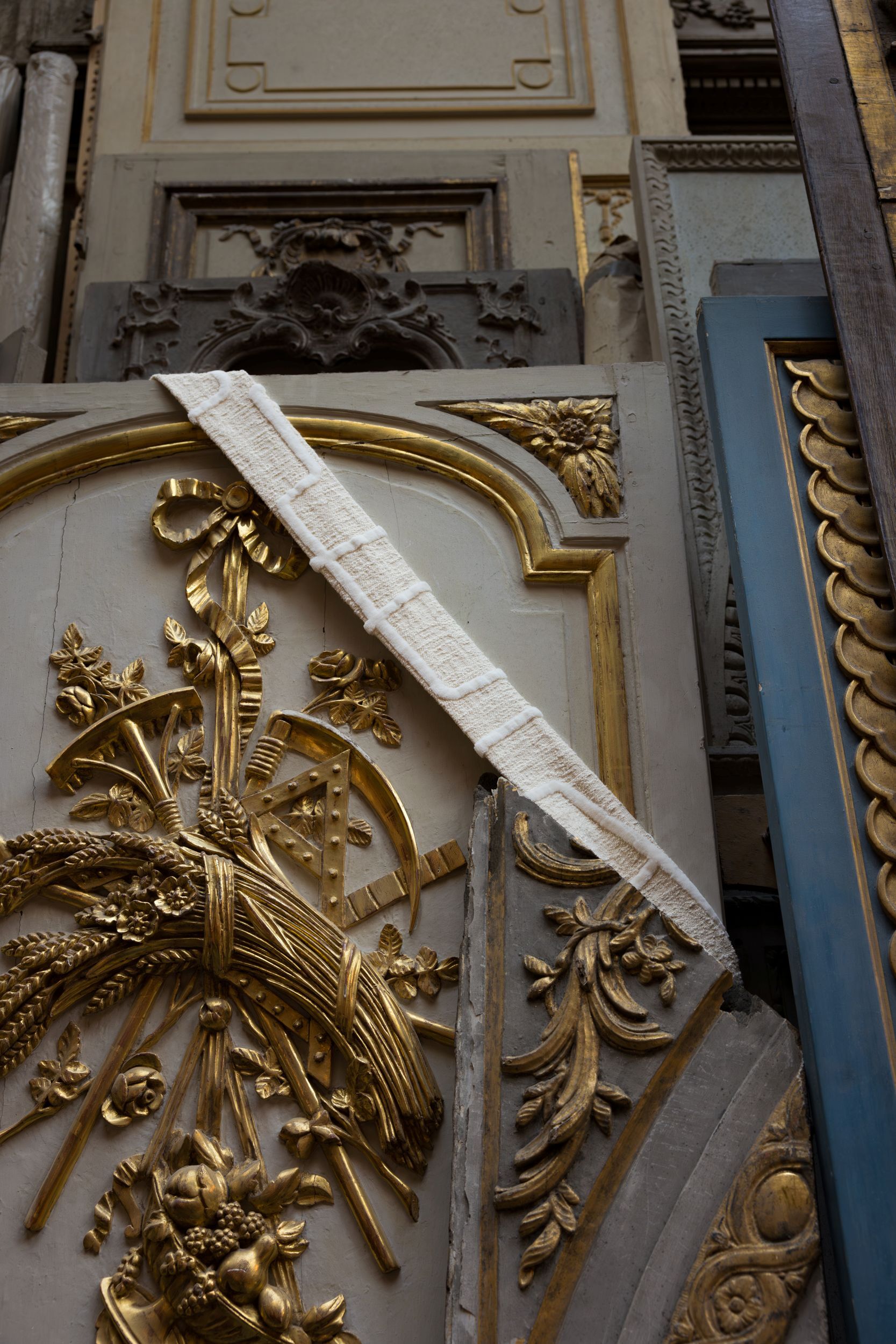 Ausdruck einer stillen Dekoration und einer zarten Präsenz im Raum ist Fil Blanc, ein 500 Meter langes Band mit Stoffen aus der Sammlung White Writings. Er verläuft entlang des Weges, verflechtet sich mit Holztafeln, Skulpturen und Säulen und führt durch die Entdeckung von Stücken aus der Unsichtbaren Sammlung und dem Mobilier National.
